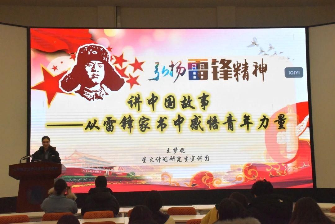 3月6日18:00,马克思主义学院“星火计划”研究生宣讲团与团委理论学习部在情景教室共同组织开展以“践行雷锋精神,筑牢红色根基”为主题的青年成长沙龙活动。此次活动由马克思主义学院研究生会主席团成员贾磊同学主持,并邀请马克思主义学院“星火计划”研究生宣讲团成员王梦妮进行《讲中国故事——从雷锋家书中感悟青年力量》的主题宣讲,带领大家一起回顾永不褪色的雷锋精神。