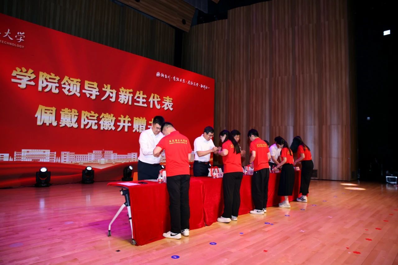 随后,学院领导为2024级新生代表佩戴院徽并赠送书籍。学院领导为同学们佩戴上象征传承与荣耀的院徽,在庄重而温馨的气氛中表达对学子们的殷切希望。与此同时,学院向每一位新生准备了一套马克思主义理论专业书籍,希望同学们能在阅读经典著作中汲取知识,拓宽视野。