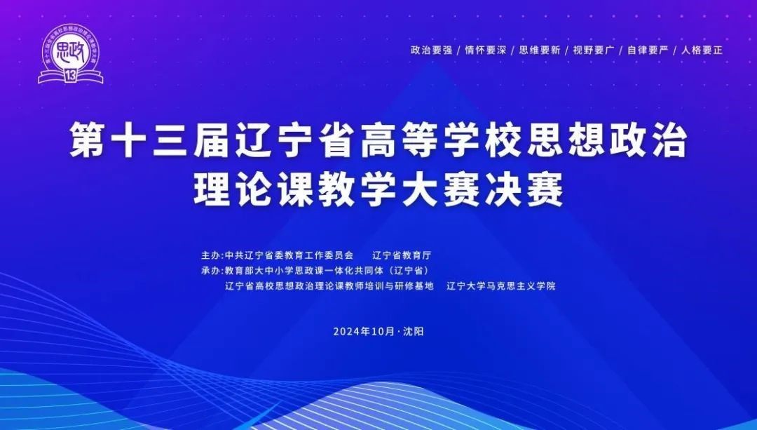 2024年10月16日至18日,第十三届辽宁省高校思想政治理论课教学大赛决赛于沈阳辽宁大厦举办,我院李丹丹老师荣获一等奖,李奇峰老师、吴腾飞老师荣获二等奖,何尊老师、张育侨老师荣获三等奖。