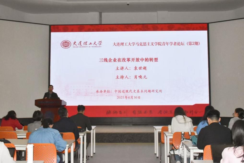 2025年4月30日下午15点,大连理工大学马克思主义学院在习近平新时代中国特色社会主义思想情景教室举办青年学者论坛第二期学术活动。本次青年学者论坛由中国近现代史基本问题研究所承办,中国近现代史基本问题研究所青年教师袁世超作题为“三线企业在改革开放中的转型”的学术报告。论坛由马克思主义学院副院长肖唤元主持,马克思主义学院师生共同参加。