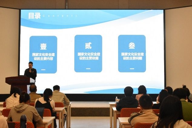 吴腾飞老师紧紧围绕国家文化安全建设,首先强调了文化差异是引起国家文化安全问题的重要原因,并以此为切入点阐述了国家文化安全建设的主要内容,指出国家文化安全是国家总体安全的子系统,意识形态安全是核心内容。接着,吴腾飞老师从理论依据和历史依据两方面深刻阐明了国家文化安全建设的主要依据,理论依据即马克思主义经典作家关于文化安全思想的重要论述,历史依据即中国共产党人的理论与实践思考。最后,在国家文化安全建设的主要问题方面,吴腾飞老师提出面对历史虚无主义思潮的进攻态势,维护主流意识形态安全要做到以下三点,一是提升马克思主义理论素养,增强历史智慧;二是推进四史学习教育常态化,强化事实真相的权威性和影响力;三是强化网络治理,营造良好舆论环境。对于如何守护好我们中华民族的文化根脉,吴腾飞老师从推进文化资源的深入挖掘和系统整合、加速实现文化资源的数字化转型两点进行了讲解。