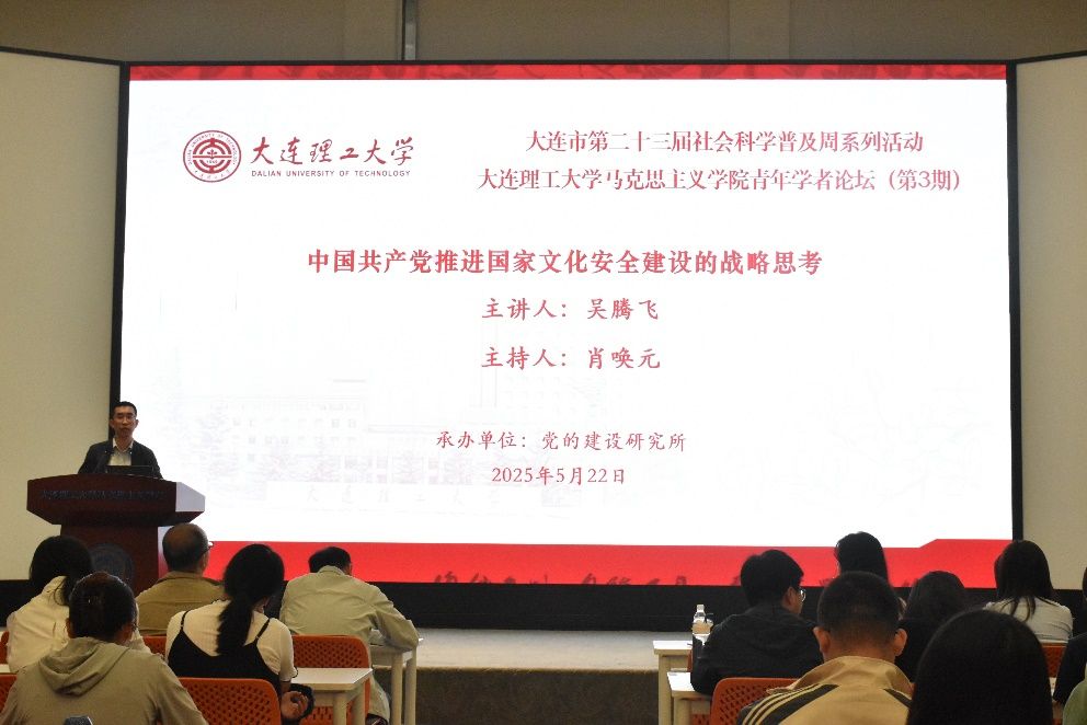 2025年5月22日下午14点,大连理工大学马克思主义学院在习近平新时代中国特色社会主义思想情景教室举办青年学者论坛第三期学术活动。本次青年学者论坛由党的建设研究所承办,党的建设研究所青年教师吴腾飞作题为“中国共产党推进国家文化安全建设的战略思考”的学术报告。论坛由马克思主义学院副院长肖唤元主持,马克思主义学院师生共同参加。