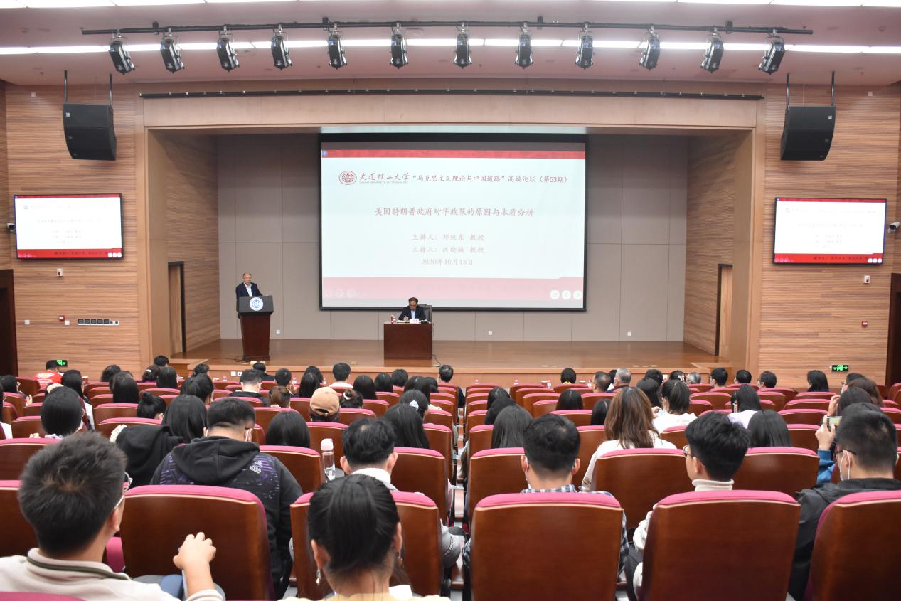 10月18日14时30分,大连理工大学马克思主义学院举办“马克思主义理论与中国道路”第五十三期高端论坛。学院邀请到第十三届全国政协委员,全国政协社会和法制委员会委员,中国社会科学院大学21世纪马克思主义高等研究院常务院长;中国社会科学院马克思主义研究院原党委书记、院长,现为全国党建研究会特约研究员,全国统战线理论研究会常务理事,中华人民共和国国史研究会常务理事,全国马克思主义研究基金会常务理事,中国科学社会主义学会常务副会长邓纯东教授,作题为《美国特朗普政府对华政策的原因与本质分析》的专题学术报告。本次论坛由马克思主义学院院长洪晓楠教授主持,大连理工大学马克思主义学院全体师生共同参加。