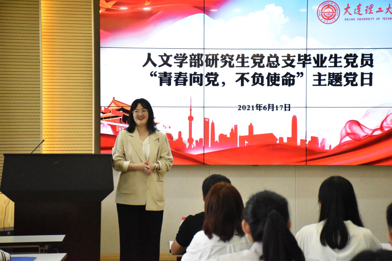 为深入学习习近平总书记在党史学习教育动员大会上的讲话,鼓励党员同志传承和发扬党的优良传统,6月17日14时,马克思主义学院第二届星火计划研究生宣讲团走进大连理工大学人文与社会科学学部,开展“青春向党,不负使命”主题党课,马克思主义学院博士研究生王宁、硕士研究生林小靖、单冬妮进行此次宣讲。本次活动由人文学部辅导员张成主持,2021届人文学部研究生党总支全体毕业生党员参加。