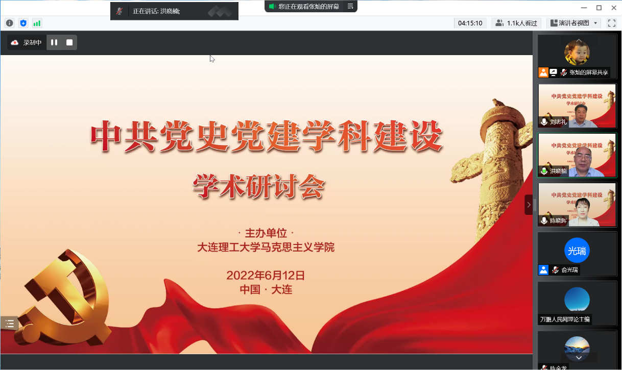 6月12日,“中共党史党建学科建设”学术研讨会采用线上会议形式顺利召开。本次会议由大连理工大学马克思主义学院主办,来自北京大学、北京师范大学、北京市委党校、东北师范大学、复旦大学、华南师范大学、清华大学、武汉大学、中国人民大学、中共中央党校等多所高校、党校专家学者,人民网、中国社会科学网等多家媒体,云南省龙陵县松山干部教育培训基地、大连理工大学滇西产业发展研究院任课教师,以及全国各高校共1000余名师生参加。研讨会开幕式由大连理工大学马克思主义学院副院长刘志礼教授主持。