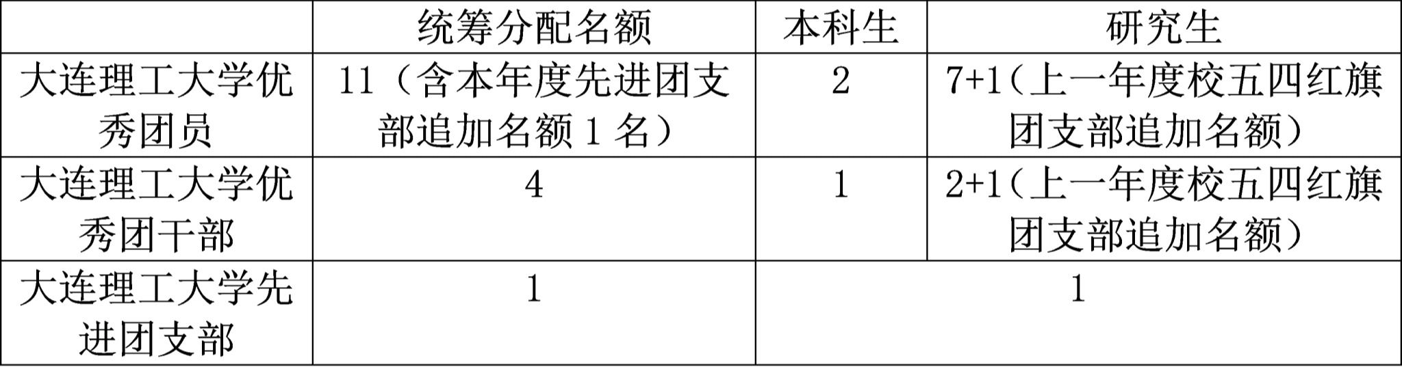结合《共青团大连理工大学委员会2023年度“两优一先”名额分配表》(附件2)及共青团大连理工大学委员会2023年度“两优一先”评选办法(各二级团组织推荐参评的优秀团员数,不超过本二级团组织团员总数的2.5%,优秀团干部数不超过本二级团组织团员总数的1%,先进团支部数不超过本二级团组织基层团支部总数的10%),现将具体分配方案公示如下: