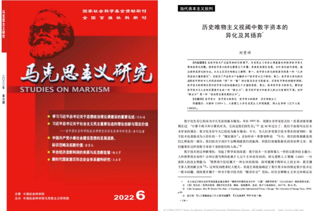 《马克思主义研究》2022年第6期刊发了大连理工大学马克思主义学院刘贵祥教授《历史唯物主义视阈中数字资本的异化及其扬弃》一文。文章立足历史唯物主义视阈,直面当代数字技术和数字资本带来的异化问题,阐明了数字资本异化的来源与发展;基于马克思对资本本性的三重维度的阐发,详细分析了数字资本异化的内涵和表现;最后从主体活动及其对象化产物的辩证关系入手,提出了扬弃数字资本的具体方法和路径,为解蔽数字资本异化这一时代课题提供了极其重要的理论参考。