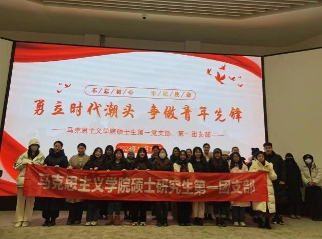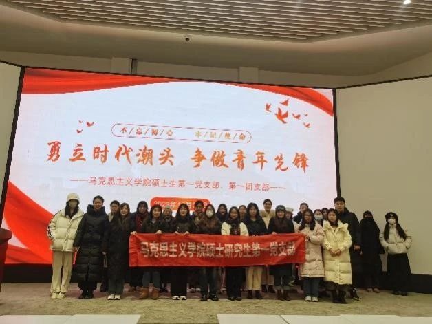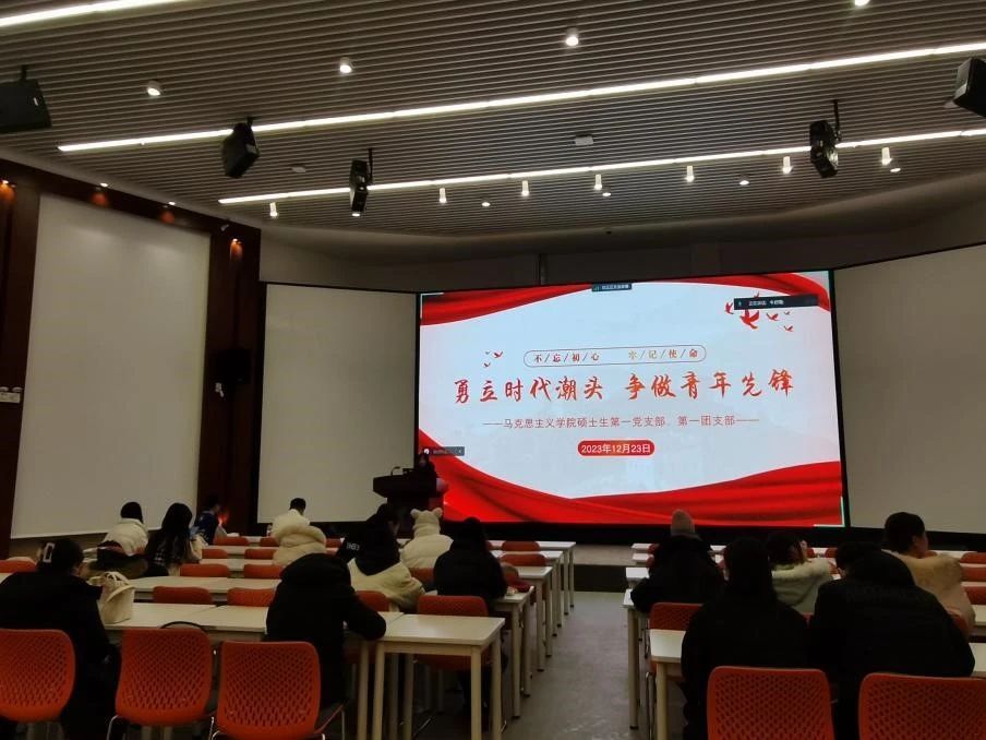 党的二十大报告中,习近平总书记勉励广大青年“要坚定不移听党话、跟党走,立志做有理想、敢担当、能吃苦、肯奋斗的新时代好青年。”为进一步践行习近平总书记对新时代青年的殷切期望,马克思主义学院硕士生第一党支部、硕士生第一团支部在2023年12月23日下午于马克思主义学院情景教室联合开展了“勇立时代潮头,争做青年先锋”主题党团共建活动暨十二月份政治理论学习,旨在引导青年同志牢记嘱托、感恩奋进,在中国式现代化新征程中,展现青年勇于担当、奋发向上的良好精神风貌。本次主题党团共建活动由党支部组织委员牛舒薇同志主持。
