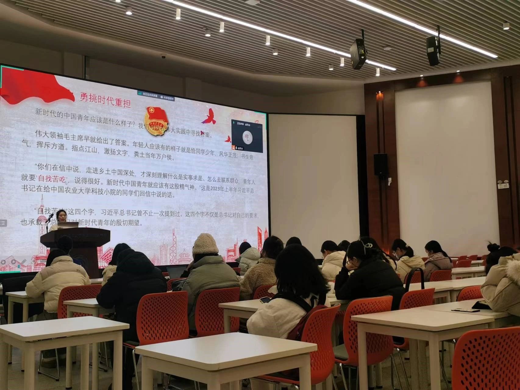 赵修萍同志以“挺膺担当,强国有我——争做新时代好青年”为主题展开宣讲,以习近平总书记在党的二十大报告中关于青年的论述为切入点,讲述习近平总书记对于新时代青年成长的拳拳重托,激励广大青年应以实际行动挺膺担当,争做新时代好青年。随后,王楚楚同志以“挺膺担当励青春,奋楫扬帆启新程”为主题进行宣讲,回顾习近平总书记在历次重大会议和重要场合的讲话中关于青年和共青团工作的要求,重温习近平总书记对于青年的殷殷寄语。她还以甘如意、韩超、文竹等青年的榜样事迹为例,展现了新时代中国青年昂扬奋进的精神风貌,鼓励新时代青年以青春之力书写青春之华章。