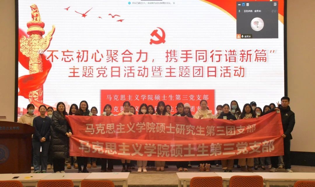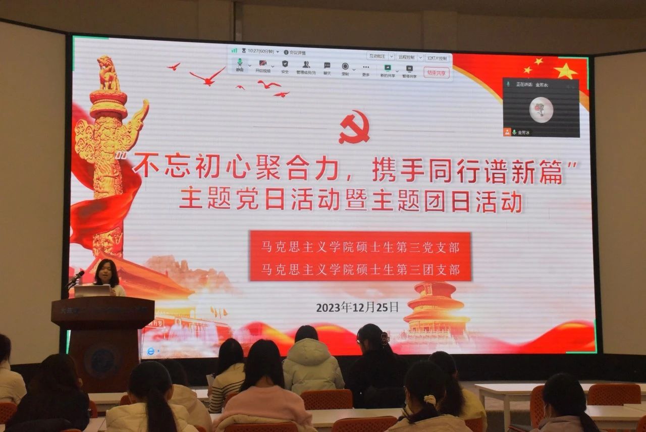 为全面贯彻落实习近平新时代中国特色社会主义思想和党的二十大精神,创新“党建带团建”的活动形式,紧密联系团组织建设和团员思想实际,扩大党组织覆盖面、增强党组织生命力,2023年12月25日下午2点,马克思主义学院硕士生第三党支部、硕士生第三团支部于情景教室联合开展了“不忘初心聚合力,携手同行谱新篇”党团共建主题活动,本次活动由硕士生第三党支部纪检委员金芳冰主持。本次党团共建共有五项议程。
