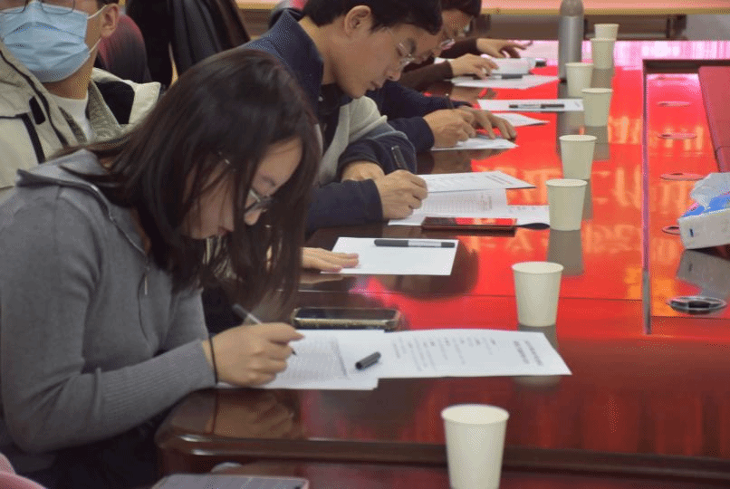 参会人员现场填写测评票,对全体党支部书记抓党建履职工作进行评价。