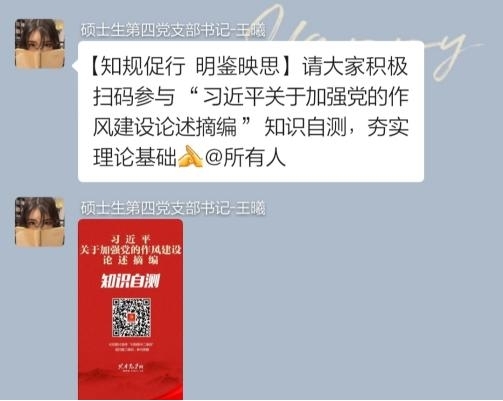 硕士生第四党支部充分利用线上与线下的学习资源,为支部全体党员构建全方位、全链条的学习模式,从线上学习强国APP的使用到线下主题党课的理论学习,从集体学习到《习近平总书记关于作风建设的重要论述》等著作的个人学习,这种线下阅读书籍、讲授专题党课与线上知识问答相结合的形式,使全体党员同志学习的积极性和主动性显著增强,同志们也在学习的过程中对中央八项规定精神有了更加深入地了解。