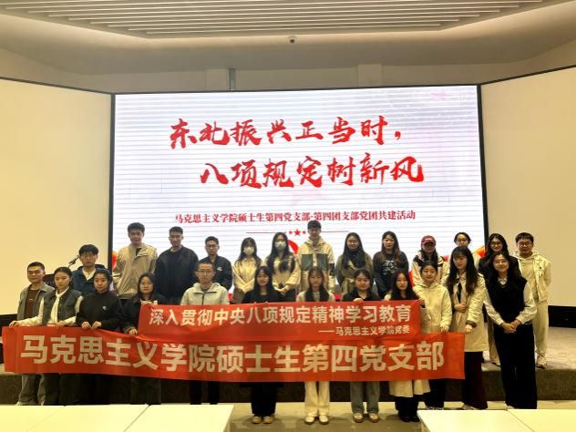2025年4月20日下午6点,马克思主义学院硕士生第四党支部、硕士生第四团支部在习近平新时代中国特色社会主义思想情景教室联合开展了“东北振兴正当时,八项规定树新风”主题党团共建活动。活动中,徐慧岩同志带领全体党员共同观看习近平总书记在辽宁考察和讲话的视频;张怡帆同志分析了违反中央八项规定精神的具体表现形式;研讨阶段,硕四党支部和硕四团支部的同志们踊跃交流,此次活动不仅增强了同志们对中央八项规定精神的理解,更激发了大家为辽宁全面振兴挺膺担当的热情。