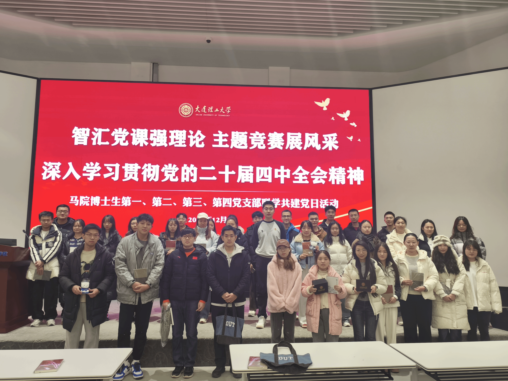 2025年12月9日,马克思主义学院博士生第一、第二、第三、第四党支部在习近平新时代中国特色社会主义思想情景教室联合举办“学习贯彻党的二十届四中全会精神”主题党日活动。活动紧扣“十五五”时期发展战略部署,以理论导学与竞技践学相结合的形式,引导博士生党员深学细悟全会精神,切实把思想和行动统一到党中央决策部署上来。