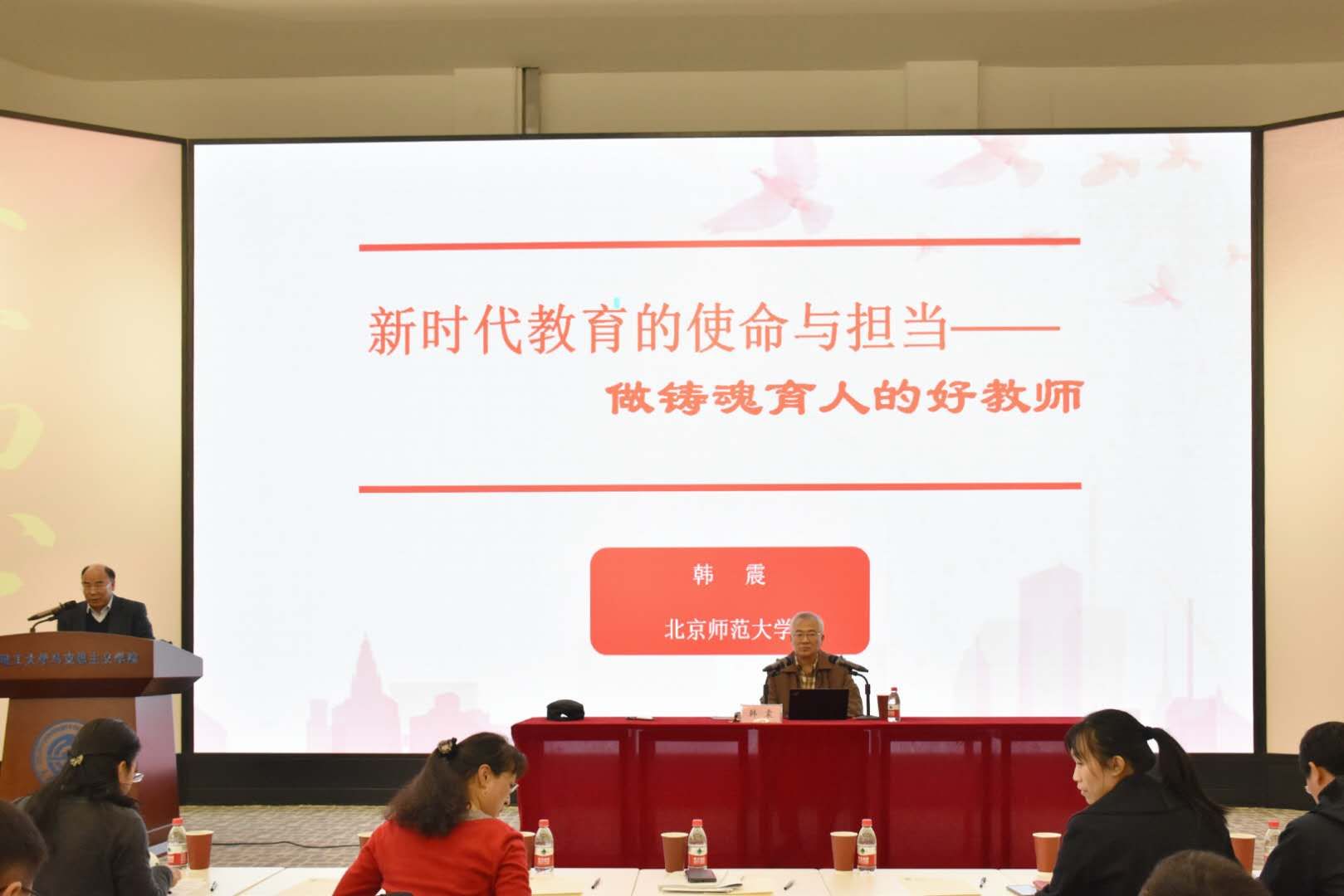 为深入贯彻落实习近平总书记在学校思想政治理论课教师座谈会上的重要讲话精神,进一步深化理解新时代教育的使命与担当,大连理工大学马克思主义学院于11月14日下午14时30分,在习近平新时代中国特色社会主义思想情景教室举办“马克思主义理论与中国道路”高端论坛第四十六期暨“学习进行时”大讲堂第九讲。学院特邀北京师范大学学术委员会主任、北京师范大学教材研究院院长、哲学思维与发展战略研究中心主任韩震教授为大家讲授题为“新时代教育的使命与担当——做铸魂育人的好教师”的主题党课。本次活动由马克思主义学院院长洪晓楠教授主持,马克思主义学院全体师生共同参加。