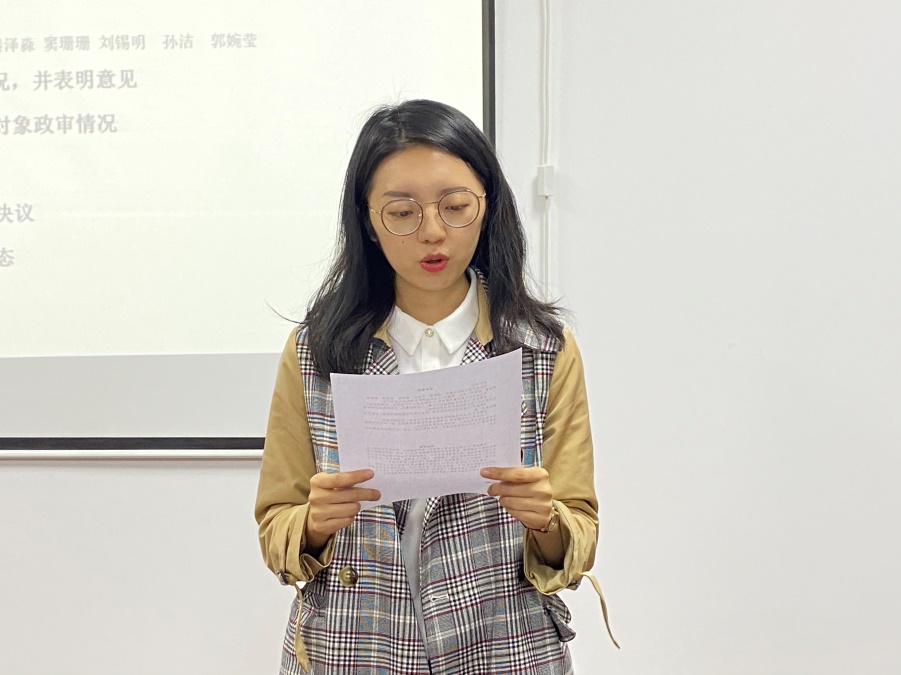 接下来两位入党介绍人分别对各位发展对象的平时表现进行了客观评价,并一致向党组织推荐接收十名发展对象为预备党员。党支部副书记赵晓萱同志代表支委会向支部大会报告十名发展对象政治审查的情况,与会党员对能否接收李蒙琴等十名发展对象为预备党员进行了充分讨论并发表意见,十名发展对象也根据支部大会讨论的情况表明了自己的态度。讨论过后,根据《中国共产党党员发展细则》,拥有投票权的十七名与会党员对能否接收李蒙琴等十名发展对象为预备党员进行了无记名投票表决,十名发展对象均全票通过,党支部副书记赵晓萱同志宣读了关于接收李蒙琴等十名发展对象为中共预备党员的决议。