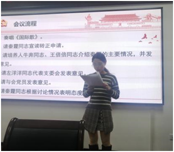 首先,由秦霞同志宣读转正申请书,并汇报本人在预备期间的思想、工作和学习情况以及需要向党组织说明的其他问题,并表明了自己已经做好接受党组织考察的准备。